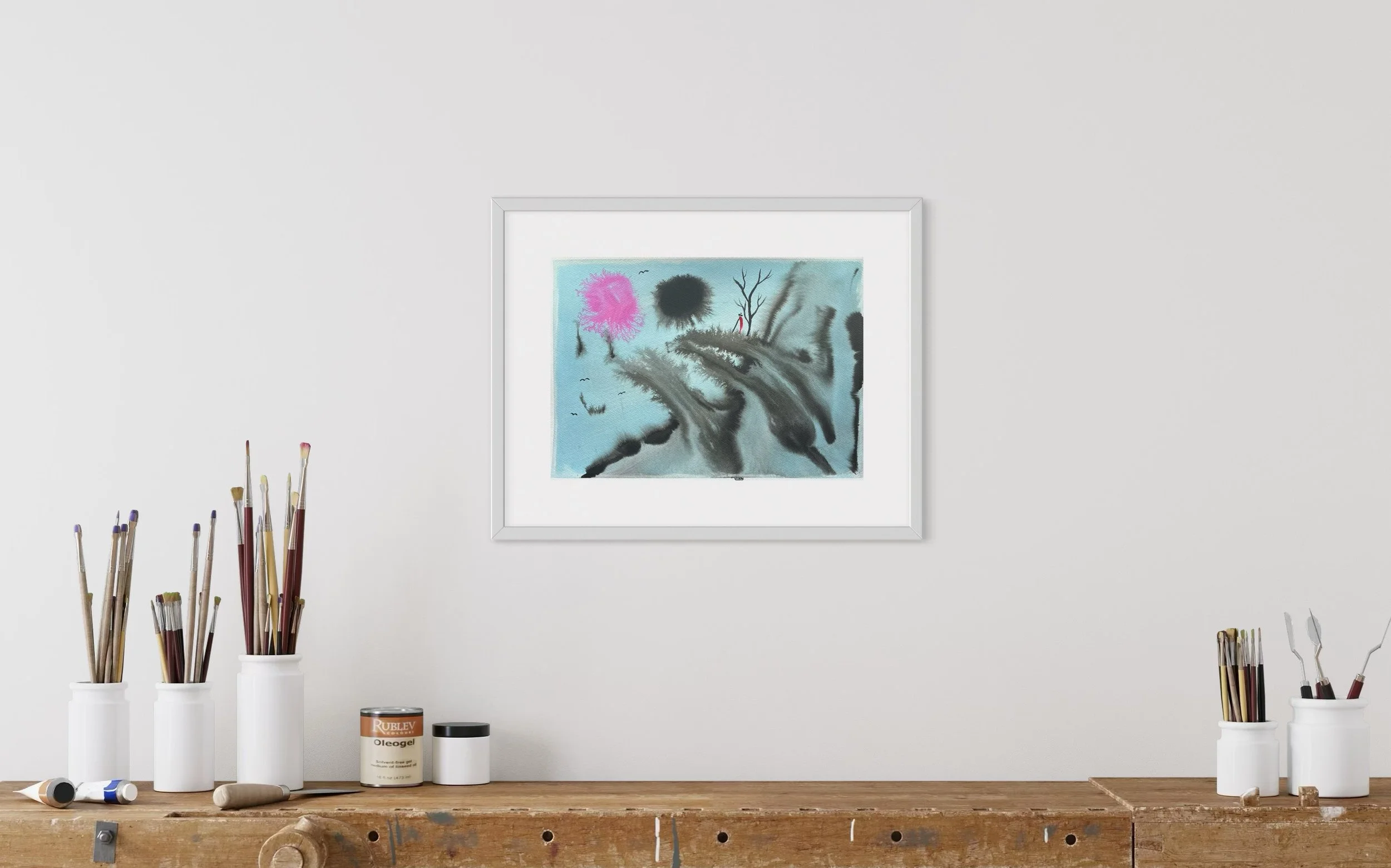 In “Monk and the Sunburst”, the wandering figure of the Monk pauses just as the clouds part, releasing a sudden, radiant burst of colour into a quiet, monochrome world. This A3-sized work from the 'Monk’s World' series captures a fleeting spiritual moment — a vision, a transformation, or perhaps a realisation.