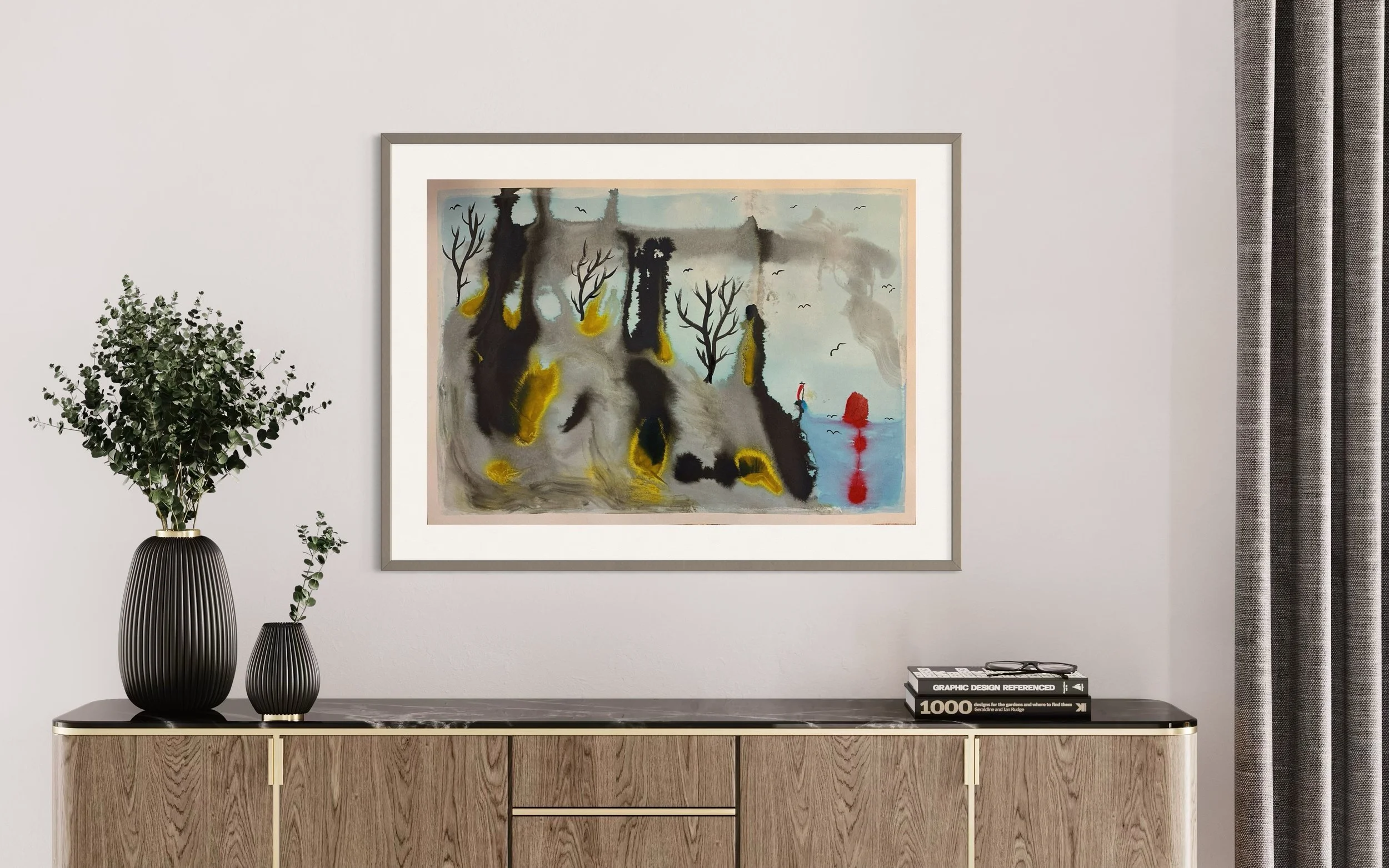 Wilderness looms behind him, emptiness stretches before. “Monk Looks Out to Sea” captures a moment of still contemplation — a quiet figure poised on the edge of decision, surrounded by stark trees, inky shadows, and the blood-red shape of something unknown on the horizon. A dreamlike scene rendered in fluid washes and bold silhouettes, this piece invites the viewer to pause and wonder: where would you go next?