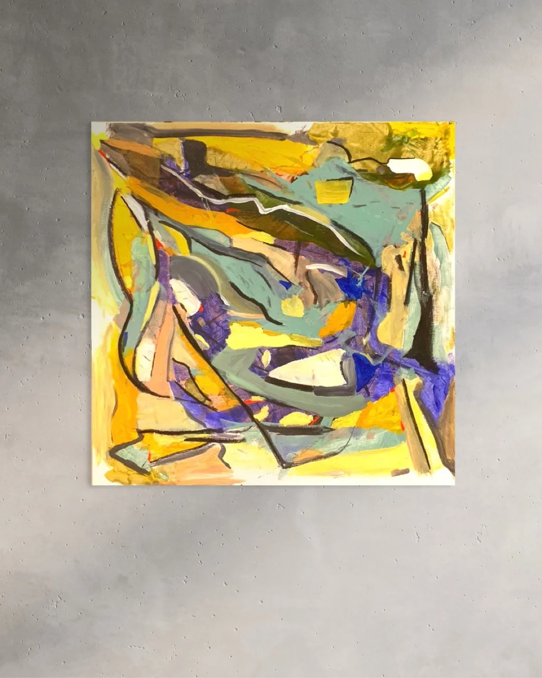 “Sunshine and Olive Trees” blends earthy greens, golden ochres, and deep Mediterranean blues into a layered abstraction evoking warmth, stillness, and dappled sunlight. Bold charcoal contours frame organic, flowing shapes, inviting viewers to linger in a space that feels both vivid and contemplative — like a summer afternoon held in memory.